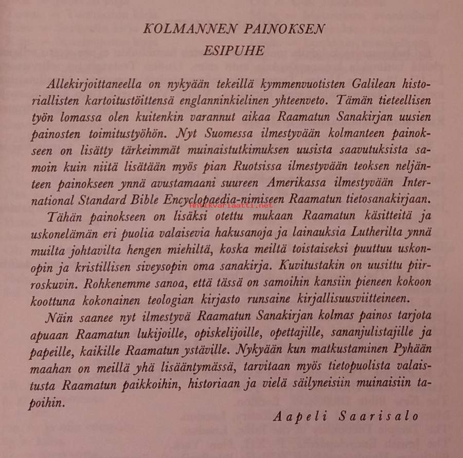 Raamatun sanakirja (3. uudistettu painos, 1965) on laaja, yli tuhannen palstan mittainen aakkosellinen hakuteos, joka selittää Raamatussa esiintyvät henkilöt, paikannimet, käsitteet ja kulttuuriset taustat. Kuvitettu. Dimensiot 21 ¤ 16 cm.