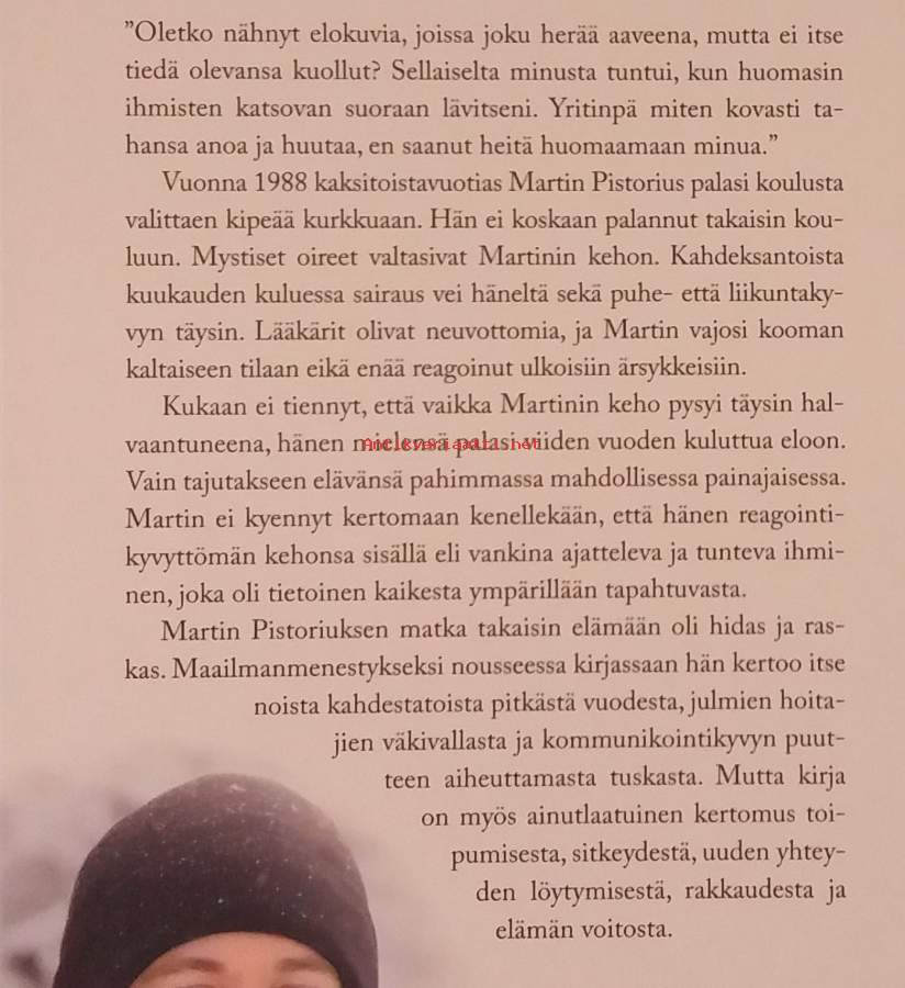 Tositarina Martin Pistoriuksesta, joka 12‑vuotiaana sairastui tuntemattomaan rappeumasairauteen ja menetti puhe‑ ja liikuntakykynsä vajoten kooman kaltaiseen tilaan. Vuosien kuluttua hänen tietoisuutensa palasi – ilman että kukaan huomasi sitä. Kirja kuvaa hänen kahdentoista vuoden painajaistaan. Dimensiot 21 ¤ 14 cm. Kuvitettu.