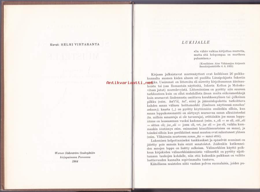 Suomen kansa muistelee - Näytteitä suomen kielen vanhoista kansanmurteista, 1964 (murteet, kielitiede). Kuvitettu