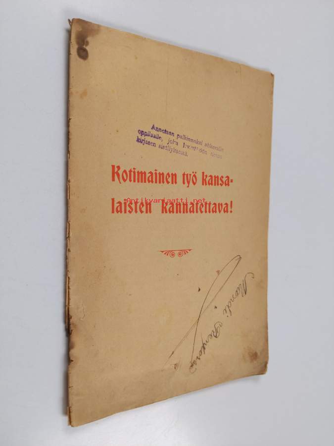 Kotimainen työ kansalaisten kannatettava! ("Annetaan palkinnoksi ahkeralle oppilaalle, joka levittäköön tietoa kirjasen sisällöstä" -leima