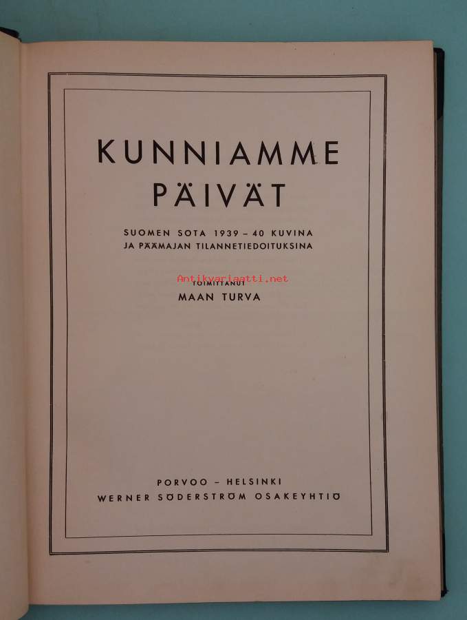Teos on laaja, suurikokoinen kuvateos Talvisodasta. Se sisältää päämajan päivittäisiä tilannetiedotuksia, runsaasti valokuvia, karttoja ja dokumentaarista aineistoa sodan etenemisestä 1939–40. Ensimmäiset painokset julkaistiin alkuperäisellä kuvituksella. Kysessä on 1. painos (ei lue painosnumeroa). Numero 1573 kannen sisäpuolella EI ole painosnumero, vaan painoksen juokseva kappalenumero. WSOY numeroi 1. painoksen kappaleet juoksevasti (yleensä 1–n). Siis sensuroimaton 1. painos. Dimensiot 30 ¤ 23 cm