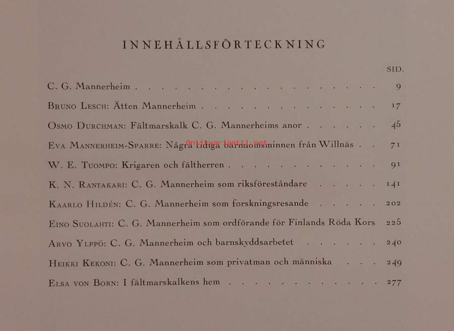 Teos on ruotsinkielinen, korkeatasoinen kunnianosoituskirja C. G. Mannerheimille. Se sisältää useiden aikansa merkittävien kirjoittajien esseitä, elämäkerrallisia katsauksia, sotilasuran arvioita, henkilökuvia ja poliittis‑historiallisia analyyseja. Mukana on myös kuvitusta, muotokuvia ja dokumentaarista aineistoa. Numeroitu laitos nr. 465. Kuvitettu. Dimensiot 30 ¤ 23 cm.