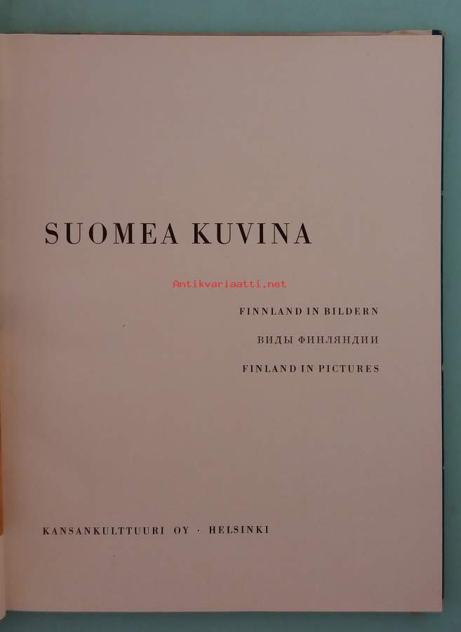 Teos on monikielinen (suomi, saksa, venäjä, englanti) kuvakirja, joka esittelee Suomen maisemia, kaupunkeja, satamia, järvimaisemia, kulttuurikohteita ja luontoa. Dimensiot 27 ¤ 22 cm.