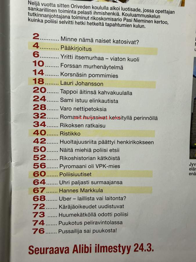 Alibi 2017 nr 11, Polttopulloisku pizzeriaan - Rainer Espoossa, Iskelmälaulaja puukotti ihailijansa hengiltä, Niko Kunnasmäki surmasi tuntemattoman miehen
