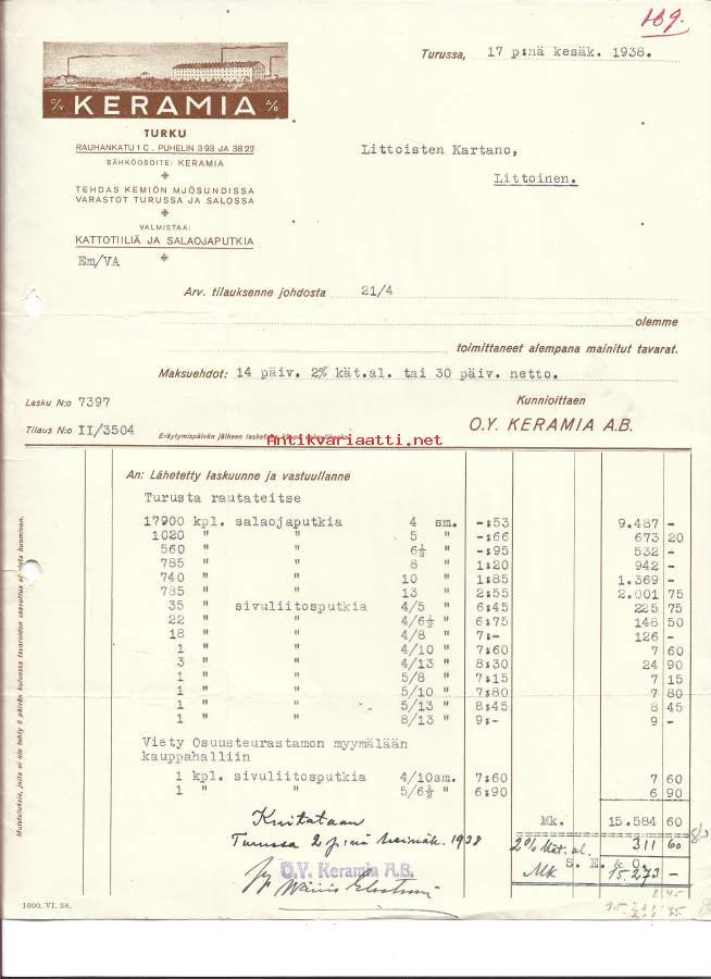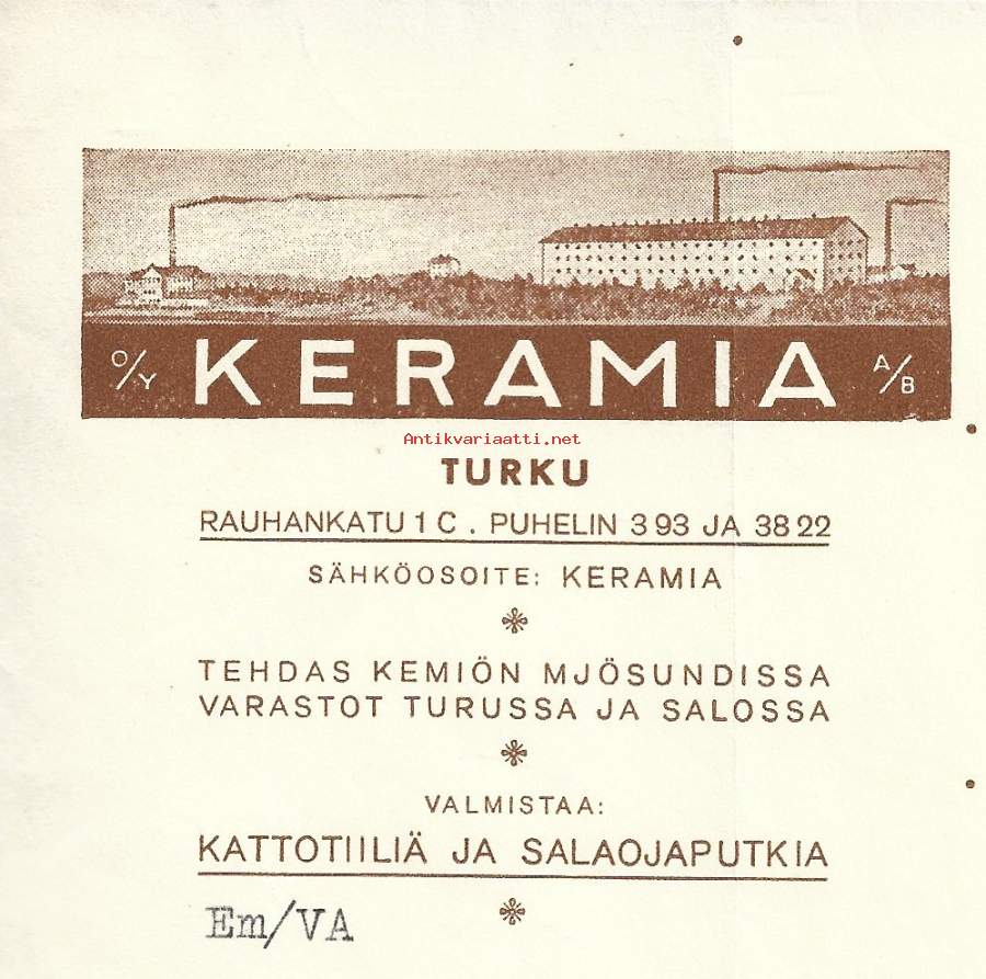 Keramia Turku lasku kattotiiliä ja salaojaputkia 1944 - firmalomake
