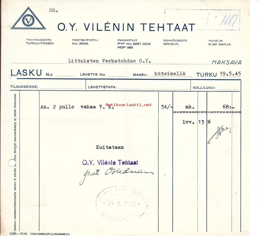 Vilénin Tehtaat Oy Turku 1945 - firmalomake