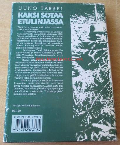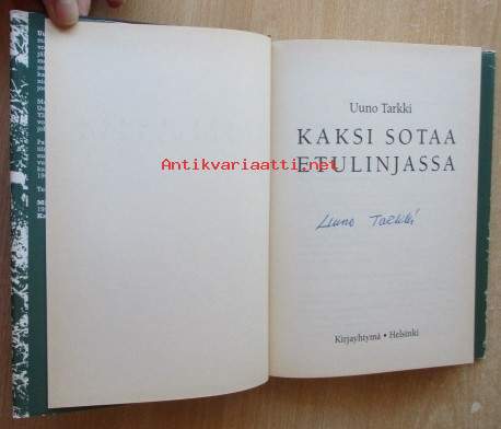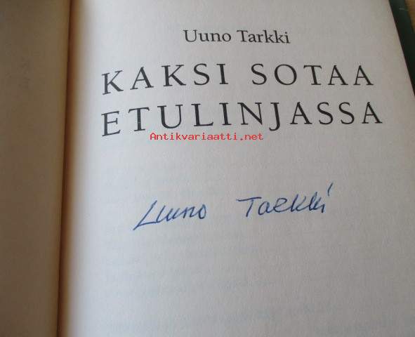 Kirjassa Uuno Tarkin signeeraus omiste, 8 kaso lisäkuva ), Kirja siisti ehjä, Kansipapereissa kulumaa ja repeämiä, Postitus kirjepakettina