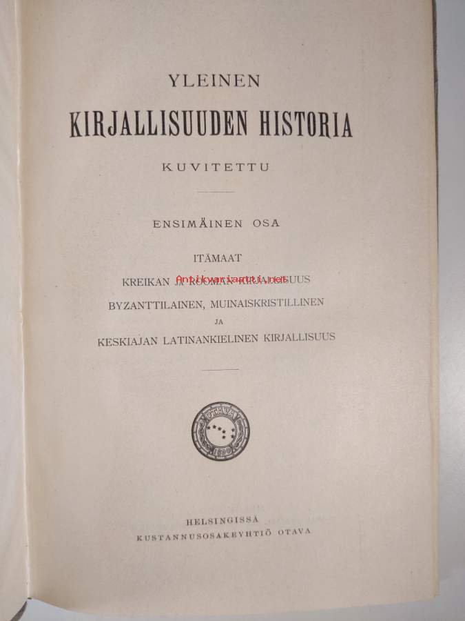 Koko nimi: Yleinen kirjallisuuden historia 1-4 : kuvitettu - Ensimmäinen osa: Itämaat ; Kreikan ja Rooman kirjallisuus, Byzanttilainen, muinaiskristillinen ja keskiajan latinankielinen kirjallisuus ; Toinen osa: Romaanilainen kirjallisuus ; Kolmas osa: Englanti, Alankomaat, Saksa ; Neljäs osa: skandinavialainen kirjallisuus, slaavilaisten kansain kirjallisuus, unkarilainen kirjallisuus, uuskreikkalainen kirjallisuusMuu(t) tekijä(t): Otto Manninen, Knut Tallqvist ym.Alkuteos: Illustreret verdens-litteraturhistorie