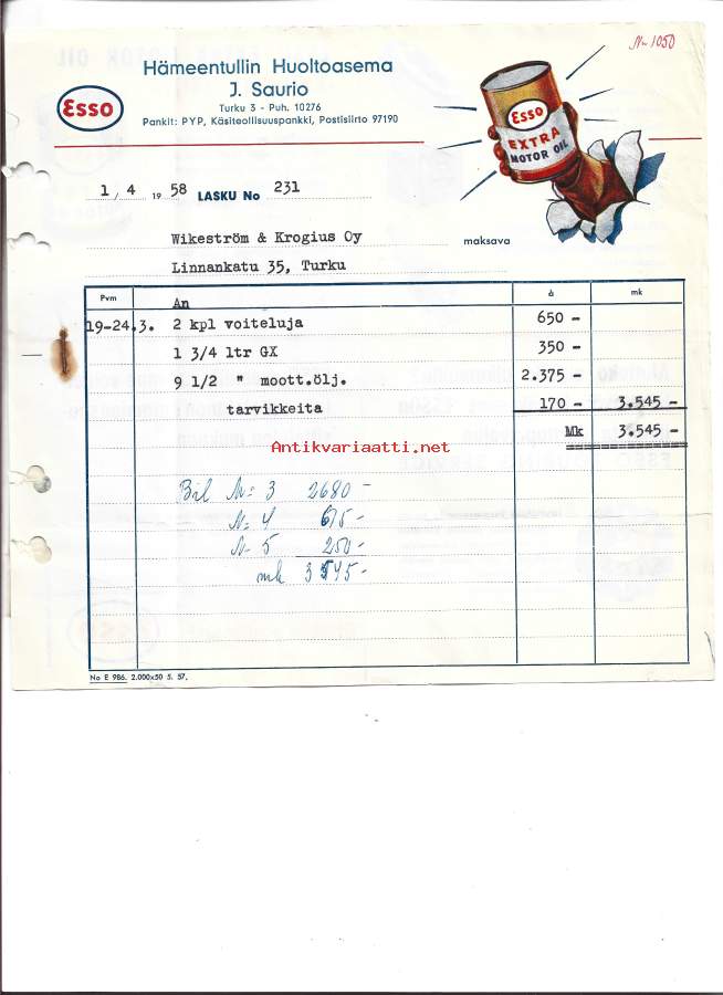 Esso Hämeentullin Huoltoasema J Saurio Turku 1956 firmalomake