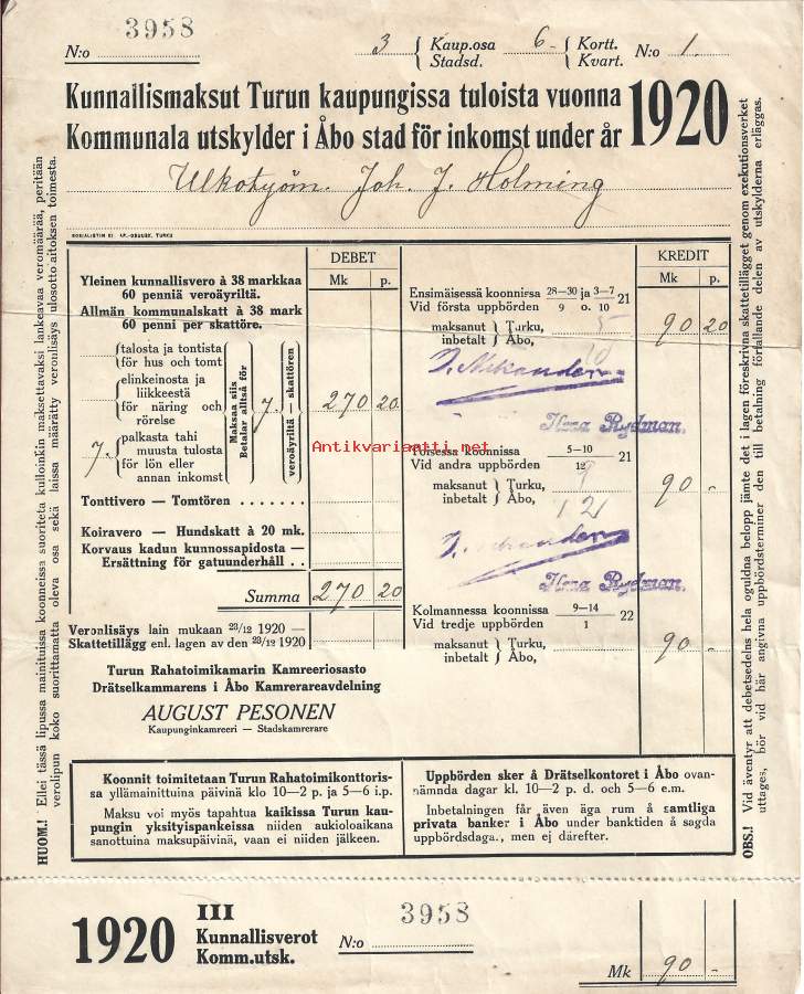 Kunnallismaksut Turun kaupungissa tuloista vuonna 1920 - firmalomake