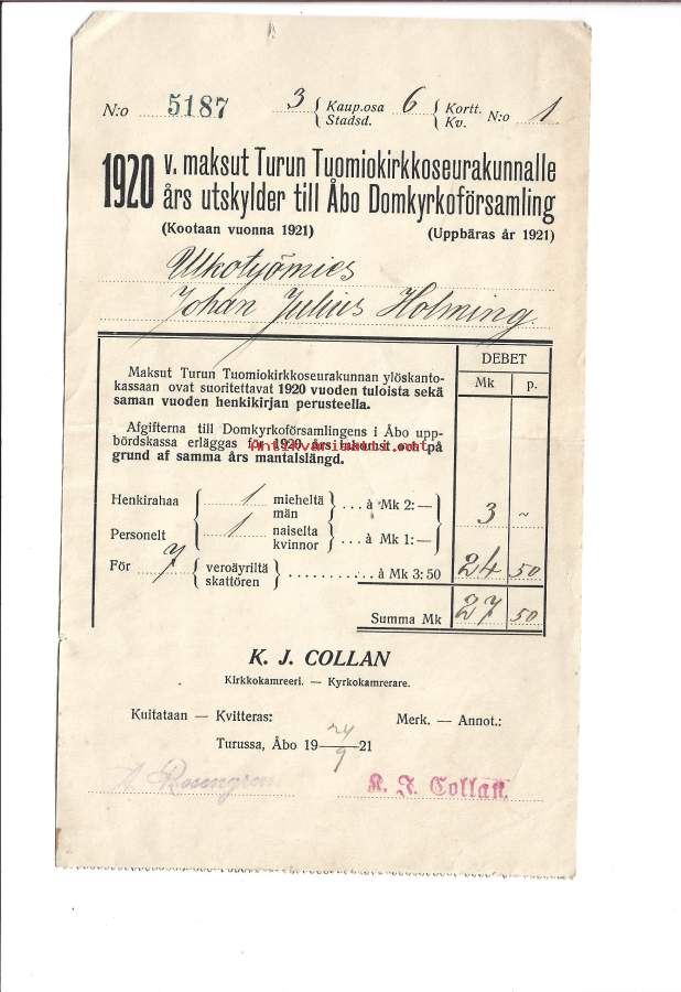 Maksut Turun Tuomiokirkkoseurakunnalle 1920 - firmalomake