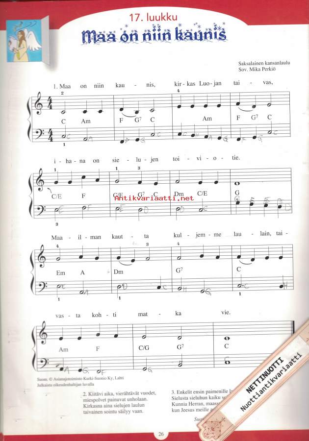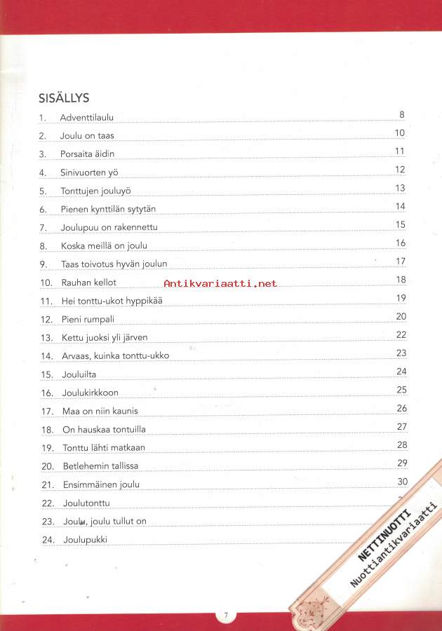 1 Adventtilaulu2 Joulu on taas3 Porsaita äidin4 Sinivuorten yö5 Tonttujen jouluyö6 Pienen kynttilän sytytän7 Joulupuu on rakennettu8 Koska meillä on joulu9 Taas toivotus hyvän joulun10 Rauhan kellot11 Hei tonttu-ukot hyppikää12 Pieni rumpali13 Kettu juoksi yli järven14 Arvaas, kuinka tonttu-ukko15 Jouluilta16 Joulukirkkoon17 Maa on niin kaunis18 On hauskaa tonttuilla19 Tonttu lähti matkaan20 Betlehemin tallissa21 Ensimmäinen joulu22 Joulutonttu23 Joulu, joulu tullut on24 Joulupukki- Suuri Helposti kuori