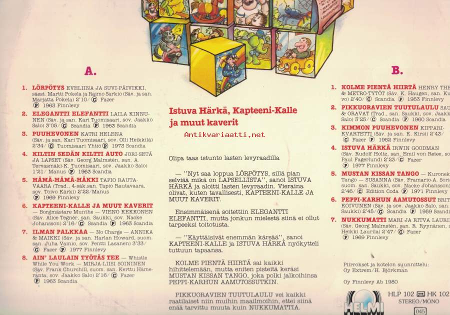 Finnlevy 1980A – Puoli A – Puoli 1. Lörpötys , Eveliina ja Suvi – Päivikki 2. Elegantti elefantti , Laila Kinnunen 3. Puuhevonen , Katri Helena 4.Kiltin sedän kiltti auto , Jori – setä ja lapset 5. Hämä – Hämä – Häkki , Tapio Rautavaara 6. Kapteeni – Kalle ja muut kaverit , Vieno Kekkonen 7. Ilman palkkaa ,Annika & Maikki 8. Ain´ laulain työtäs tee , Mirja -Liisi Soininen . B – Puoli 1. Kolme pientä hiirtä , Henty Theel & Merto – Tytöt 2. Pikkuoravien tuutulaulu Saukki & oravat 3. Kimmon puuhevonen , Kippari – Kvartetti 4. Istuva Härka , Irwin Goodman 5. Mustan kissan tango , Susanna 6. Peppi – Karhun aamutossut , Brita Koivunen 7. Nukkumatti , Mari ja Ritva Laurila .- Postipaketti