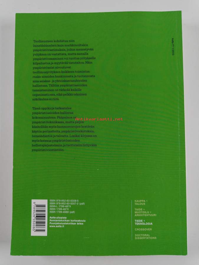 Muu(t) tekijä(t): Olli Dahl, Mikko MartikkaSarja: Aalto-yliopiston julkaisusarja. Tiede + teknologia 1/2013Asiasanat: teollisuus, ympäristönsuojelu, luonnonvarat, vesihuolto, ympäristöongelmat, ympäristökysymykset, vesiensuojelu, ympäristö, käsittely, ilmastonsuojelu, kestävä käyttö, jätehuolto, jätteet, prosessiteollisuus, ympäristömyrkyt, miljö, meluntorjunta, ympäristökuormitus, miljöfrågor, avfallshantering, vattentjänster, avfall, miljögifter, energiateollisuus, processindustri, energiindustri