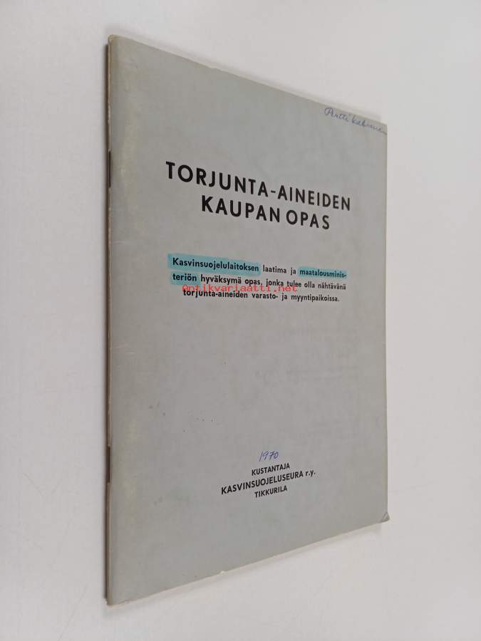 Koko nimi: Torjunta-aineiden kaupan opas : Kasvinsuojelulaitoksen laatima ja maa- ja metsätalousministeriön hyväksymä opas, jonka tulee olla nähtävänä torjunta-aineiden varasto- ja myyntipaikoissaMuu(t) tekijä(t): Erkki RytsäMerkinnät: omistajamerkintäSarja: Kasvinsuojeluseuran julkaisuja 56