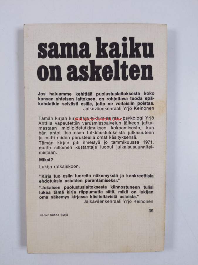 Sama kaiku on askelten, 1971. Saatesanat jalkaväen kenraali Yrjö Keinonen. Puolustuslaitoksen kehittämisehdotuksia ja suoraa kritiikkiä vallitsevaan tilanteeseen.