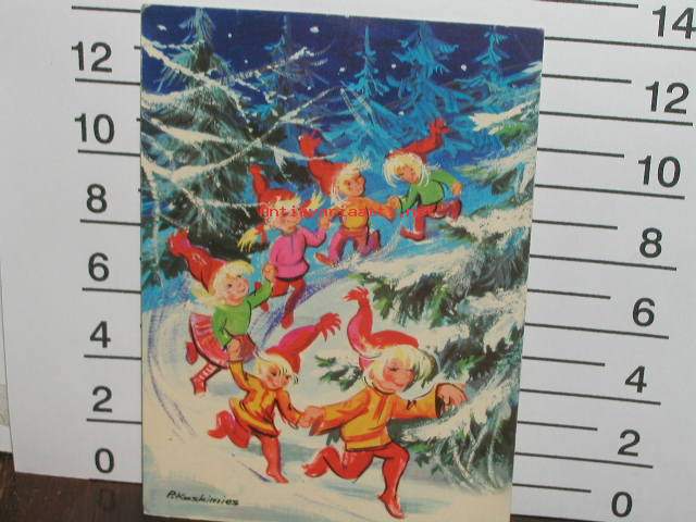 Postikortti, joulukortti kerääjälle Lars Carlsonin piirtämä iloinen tontut jouluaterialla kortti. Kulkenut 2019