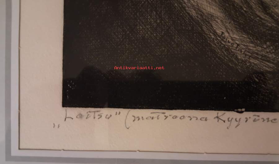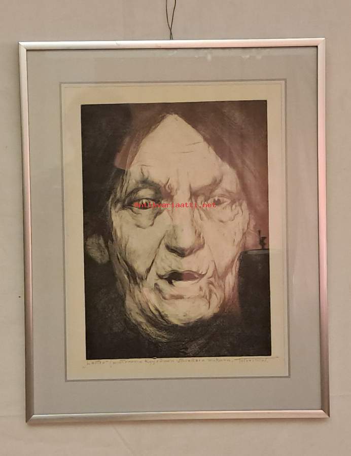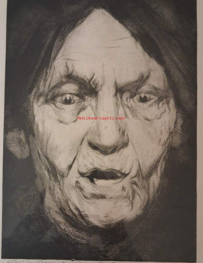 Myydään voimakas ja tunnelmallinen Toivo Talven (1881–1940) alkuperäisgrafiikka "Loitsu". Teos on arvokas kuvaus karjalaisesta matroonasta ja kansanperinteestä. Tyylisuunta: Kansallinen realismi ja ekspressionistinen muotokuvaus. Teos on psykologisesti vahva; naisen katse ja ilme välittävät intensiivisen, lähes maagisen tunnelman. Teos on otsikoitu "Loitsu". Alareunan teksti tarkentaa: "matrona Kyyrönen Väisäsen mukaan". Kyseessä on muotokuva kokeneesta karjalaisesta naisesta, mahdollisesti parantajasta tai itkuvirsien taitajasta. Viittaus Väisäseen tarkoittanee kuuluisaa kansanmusiikkitutkijaa A.O. Väisästä, jonka tutkimusmatkoilla kerättyä aineistoa Talvi on käyttänyt pohjanaTeos on toteutettu mestarillisella otteella, ja se pohjautuu kansantieteilijä A.O. Väisäsen tallentamaan perinteeseen. Muotokuva on psykologisesti vangitseva ja teknisesti hienosti toteutettu metalligrafiikan lehti.Tämä on harvinainen kohde suomalaisen historian, Karjalan perinteen tai laadukkaan grafiikan ystävälle.Tiedot:• Taiteilija: Toivo Talvi• Teoksen nimi: Loitsu (Matrona Kyyrönen)• Tekniikka: Metalligrafiikka• Koko: n. 40 x 30 cm (lehti), siisti nykyaikainen kehystys.• Kunto: Hyvä, aitoa ajan patinaa.Hinta: 250 € / Järkevä tarjous Sijainti: Kouvola/Tampere Toimitustapa: Mieluiten nouto teoksen herkkyyden vuoksi, mutta postitus onnistuu ostajan vastuulla ja kuluilla Matkahuollon välityksellä periaatteella: Ovelta ovelle, särkyvää-kategoriassa. Pakkauskulut toteutuneina n. 10 e. Matkahuollon veloitus n. 70 euroa. Palautukset ostajan piikkiin. Ennakkomaksu !!!!!
