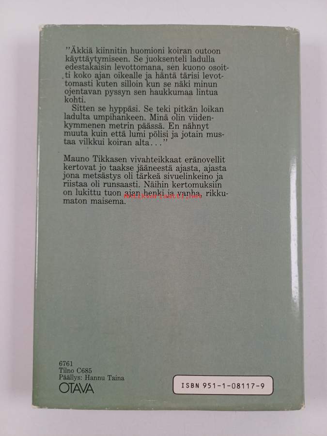 Hyvä. Pienoista tahraisuutta, pienoista kolhua selkämyksen päissä, pienoista kulumaa, selkämyksessä hieman vinoutta. Kansipaperin kunto: jonkin verran kulumaa/pienoisia repeämiä