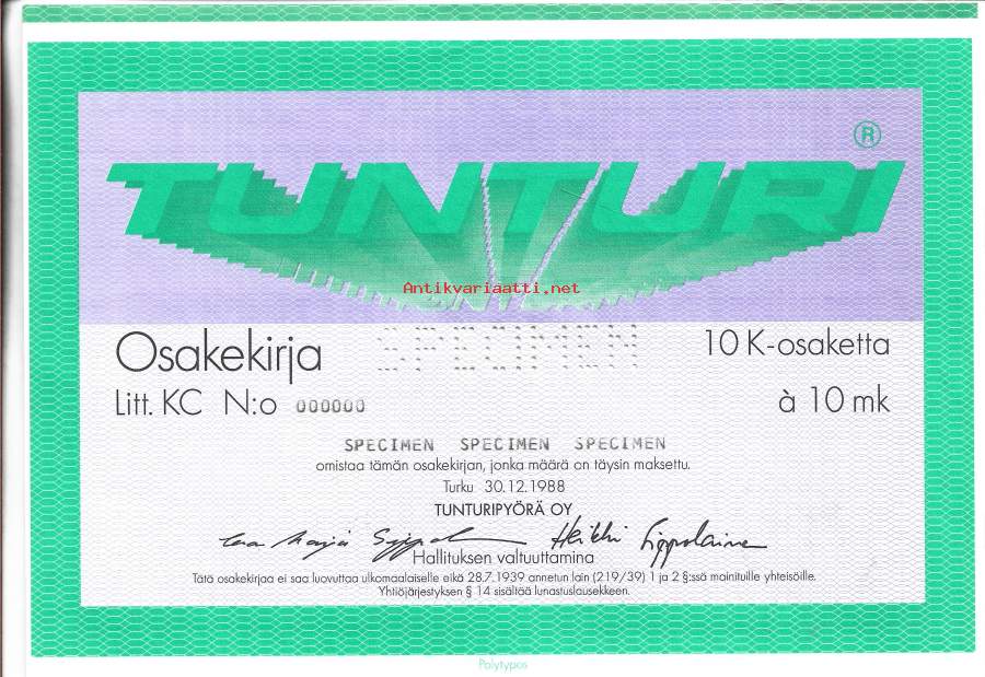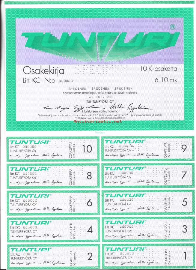 Tunturi Oy osakekirja, Turku 1988