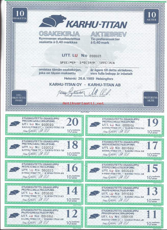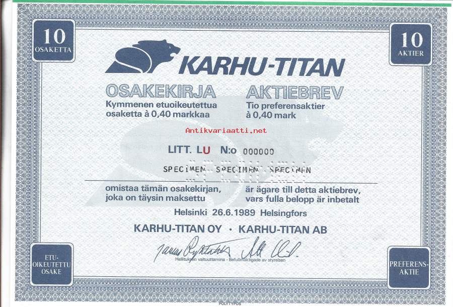 Karhu-Titan Oy osakekirja, Helsinki 1989