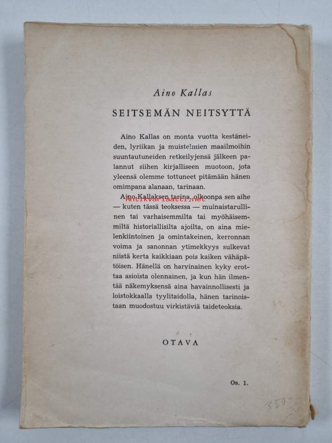 Tyydyttävä. Pienoista läikkää, hieman tahraisuutta, jonkin verran repeämää selkämyksen päissä, jonkin verran kulumaa, selkämyksessä hieman vinoutta, selkämyksessä lukutaittumaa