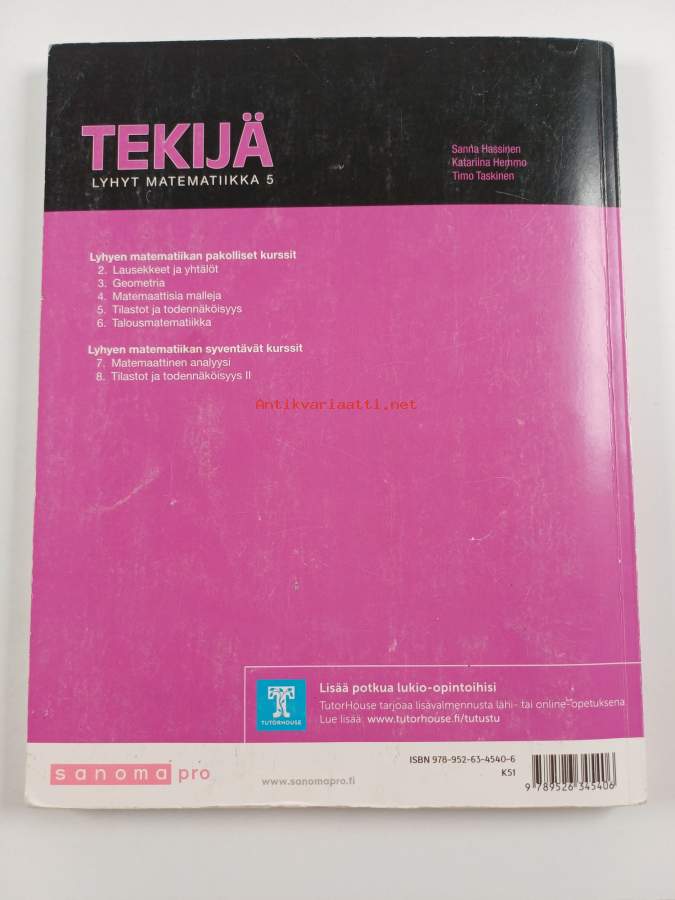 Muu(t) tekijä(t): Katariina Hemmo, Timo Taskinen ym.Sarja: Tekijä 5 ; lyhyt matematiikkaAsiasanat: matematiikka
