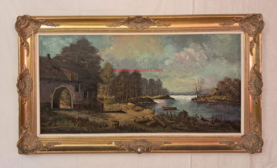 Myydään erittäin kookas ja näyttävä öljyvärimaalaus kankaalle. Taiteilija J. Huysynin tunnelmallinen teos kuvaa historiallista rantamaisemaa komean pilvitaivaan alla. Maalaus on teknisesti hieno, ja siinä on käytetty elävää sivellintekniikkaa, joka antaa pinnalle kolmiulotteisuutta.Kyseessä on tyypillinen keskieurooppalainen (usein hollantilainen tai belgialainen) "ammattimaalari", jonka teoksia on tuotu Suomeen 1970–80-luvuilla taidekauppiaiden toimesta. Nämä taiteilijat keskittyivät tuottamaan korkealaatuisia, klassisia maisemia nimenomaan kotien sisustukseen.Teos on kehystetty todella massiivisilla ja upeilla kultakehyksillä, jotka kruunaavat kokonaisuuden. Täydellinen valinta olohuoneen keskipisteeksi tai takan yläpuolelle.Taitelija: J. Huysyn ???• Aihe: Historiallinen rantamaisema• Koko (ilman kehyksiä): 58 x 117 cm• Ulkomitat kehysten kanssa: n. 75 x 135 cm• Kunto: Maalaus on erinomainen. Kehyksen yläkulmassa pieni ajan tuoma kolhu (huomioitu hinnassa), muuten todella hieno.Tämä on harvoin tarjolla oleva "panoraamakokoinen" taideteos, joka tuo välitöntä arvokkuutta tilaan.Toimitus: Mieluiten nouto koon ja särkyvyyden vuoksi.