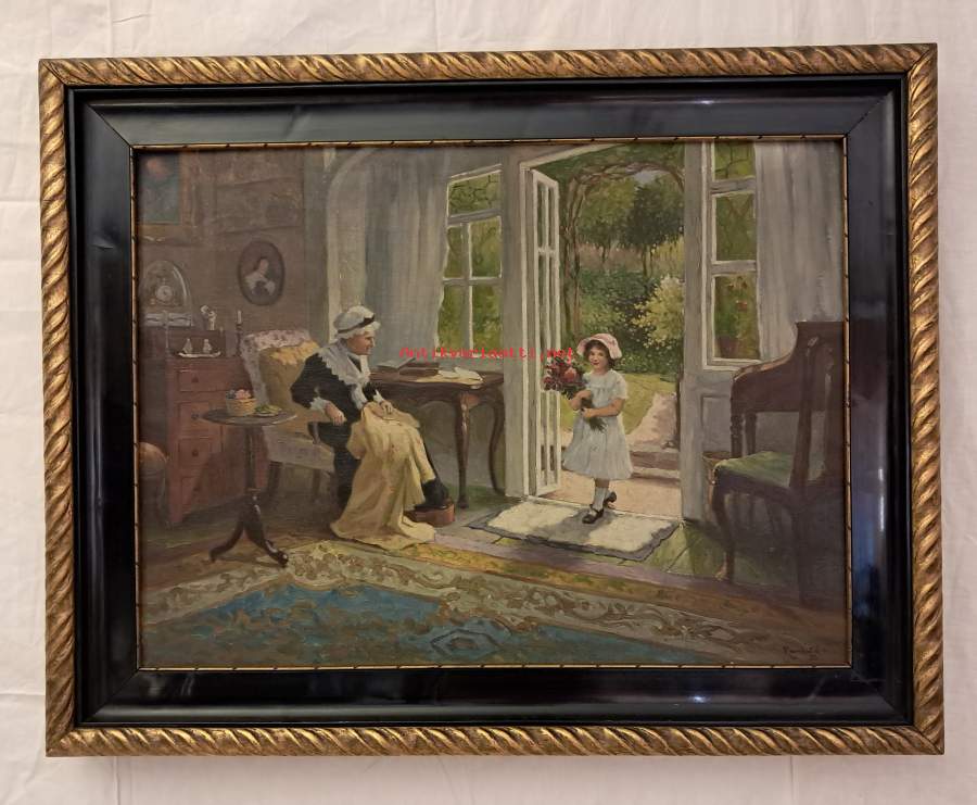 Myydään kaunis ja valoisa öljyvärimaalaus kankaalle vuodelta 1928. Teos on tunnelmallinen kuvaus aurinkoisesta iltapäivästä, jossa pieni tyttö tuo kukkia isoäidilleen. Maalaus on täynnä kodikasta lämpöä ja upeita yksityiskohtia, kuten huoneen sisustus ja puutarhan vehreys avoimesta ovesta. Teos on idyllistä realismia tai kotoisaa genre-maalausta. Siinä on vaikutteita 1800-luvun lopun pohjoismaisesta sisäkuvauksestaSigneeraus näyttää olevan "Rambald" tai vastaava, ja vuosiluku -28 (1928). Tämä sijoittaa teoksen klassiseen modernismiin, jossa suosittiin vielä perinteisiä aiheita.• Taiteilija: Rambald (signeerattu ja päivätty -28). • Koko: 50 ¤ 70 cm (kehysten kanssa hieman suurempi).• Kehykset: Alkuperäiset, aikakaudelle tyypilliset musta-kultaiset koriste-kehykset.• Kunto: Hyvä, värit ovat säilyneet raikkaina.Tämä teos on täydellinen lisä kotiin, jossa arvostetaan tarinallista taidetta ja 1920-luvun klassista tyyliä. Sopii erinomaisesti esimerkiksi olohuoneen tai ruokailutilan paraati paikalle.