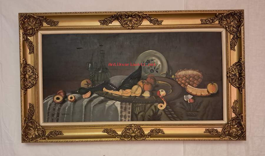 Myydään upea, suurikokoinen öljyvärimaalaus kankaalle. Taiteilija W. Tormansin klassinen asetelma, joka henkii vanhan ajan arvokkuutta. Teoksessa on kuvattu lintusaalis, hedelmiä ja hienoja lasiesineitä upeassa valossa. W. Tormans: Kyseessä on jälleen keskieurooppalainen, todennäköisesti belgialainen tai hollantilainen taiteilija. Tormans on tunnettu juuri tällaisista perinteisistä asetelmista, joita on myyty laajasti eurooppalaisissa gallerioissa 1900-luvun puolivälin jälkeen. Hänen teoksensa ovat vakaita "huonekalutaiteen" edustajia, joilla on säilyvä käyttöarvo.Maalauksessa on erittäin massiiviset ja näyttävät kultakehykset, jotka ovat loistavassa kunnossa. Tämä teos on täydellinen valinta luomaan tunnelmaa ruokasaliin, takkahuoneeseen tai kirjastoon.• Taiteilija: W. Tormans ??• Aihe: Perinteinen asetelma / Metsästysaihe• Koko (ilman kehyksiä): 50 x 100 cm• Koko kehysten kanssa: n. 70 x 120 cm• Kunto: ErinomainenTästä todella näyttävä ja kookas taideteos, joka tuo välitöntä tyyliä kotiisi.