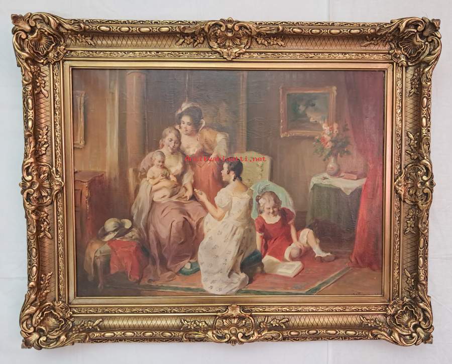 Myydään näyttävä ja tunnelmallinen vanha öljyvärimaalaus, joka huokuu klassista arvokkuutta. Teos esittää herkkää ja idyllistä sisäkuvaa, jossa naiset ja lapset ovat kokoontuneet yhteen. Erittäin taitavasti maalattuja yksityiskohtia, kuten kankaiden tuntua ja valoa. Maalaus edustaa klasistista genremaalausta tai biedermeier-henkistä sisäkuvaa. Aiheena on idyllinen perhe-elämä tai "kotipiiri", joka oli erittäin suosittu teema 1800-luvun lopulla ja 1900-luvun alkupuolellaAlalaidassa näyttäisi olevan signeeraus, joka muistuttaa nimeä "Dott" tai vastaavaa. Kyseessä on todennäköisesti keskieurooppalainen (esim. saksalainen tai itävaltalainen) ammattitaiteilijaTämä on täydellinen valinta kotiin, jossa arvostetaan klassista tyyliä, tai vaikkapa kartanomaiseen ympäristöön. Maalaus on kookas ja nousee tilan keskipisteeksi.• Tekniikka: Öljy kankaalle• Aihe: Klassinen genremaalaus / perhe-elämä• Mitat: Maalaus n. 58 x 80 cm (kehysten kanssa huomattavasti suurempi)• Kehykset: Erittäin upeat, paksut ja koristeelliset kultakehykset, jotka ovat jo itsessään arvokkaat.• Kunto: Hyvä ja siisti ikäisekseen.Tästä upea ja arvokas sisustuselementti suoraan seinälle ripustettavaksi!