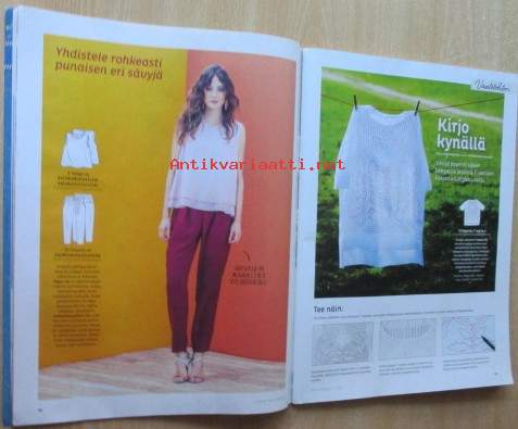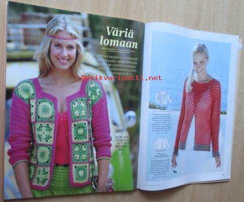 Suuri Käsityökerho 6/1975. virkataan kesäverho, kaitaliina, bikinit ja takki. Mukana kaava-arkki 12 kaksi jakkua jne. Katso sisältö kuvasta.