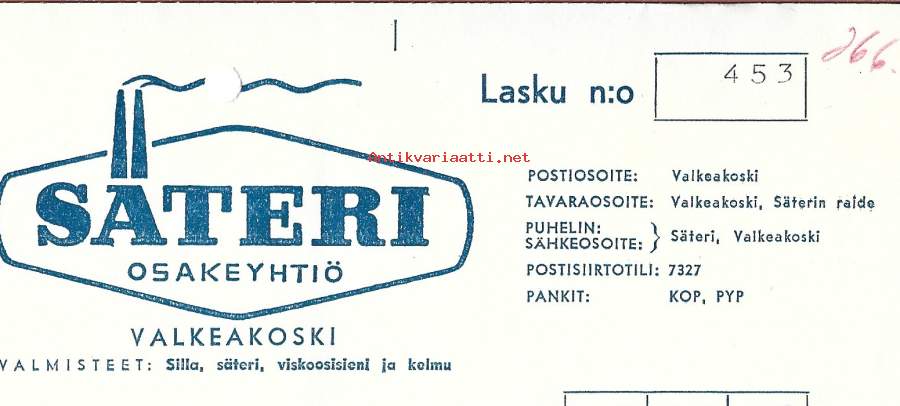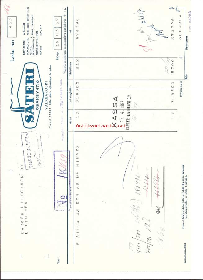 Säteri Oy Valkeakoski 1957 firmalomake