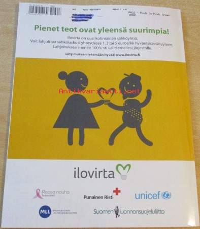 kuvitettu, Lehti siisti ehjä, takakannessa yläreunassa edellisen omistajan nimi ylivedetty kynällä, Postitus kirjepakettina