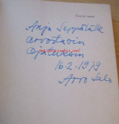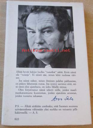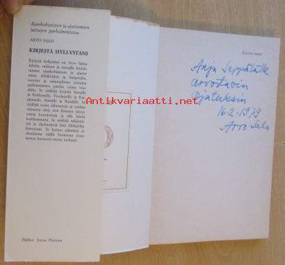 kirjassa Salo Arvo ( Salon omiste, signeeraus ja päiväys ), sekä edellisen omistajan ex-libris, Kirja siisti ehjä, Postitus kirjepakettina