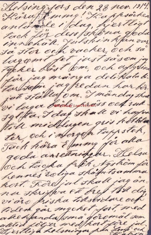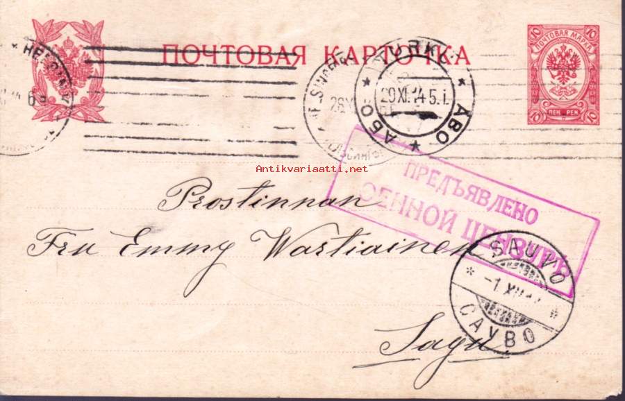 Filatelia Suomi - Ehiökortti 28.11.1914. Sensuurileima: Punainen suorakaideleima: ”ПРЕДЪЯВЛЕНО ВОЕННОЙ ЦЕНЗУРѢ”,Helsinki 28.11., Turku 29.11. Sauvo 1.12.