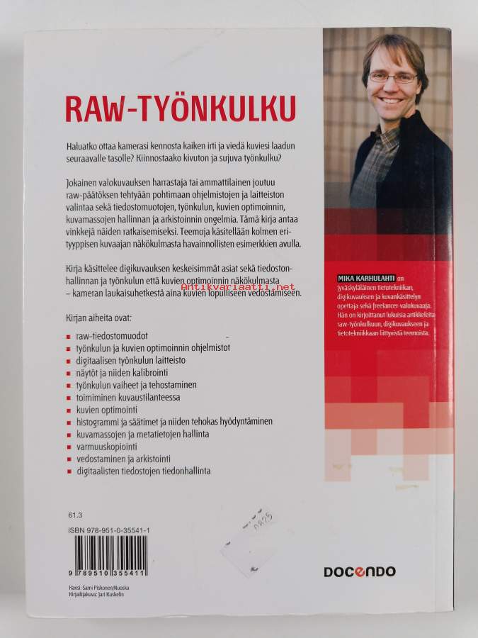 Sarja: WSOYpro/Docendo-tuotteet; DocendoAsiasanat: valokuvaus, valokuvat, tekniikka, käyttöjärjestelmät, tiedonhallinta, digitaalitekniikka, atk-laitteet, kuvankäsittely, tietojärjestelmät, Photoshop, Photoshop Lightroom, digitaalikamerat, digitaalikuvaus, tiedostot, tiedostomuodot, tietokoneohjelmat, arkistointi, digitaalinen tallennus, optimointi, järjestelmät, RAW (tiedostomuoto), formaatit, hallinnointi, tekniikat, sähköinen arkistointi, vedostus, kuvantallennus, vedostus (valokuvaus), varmuuskopiointi, Adobe Camera Raw, RAW
