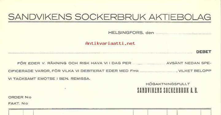Sandvikens Sockerbruk Ab- blanco firmalomake , Frenckellin kirjapainon näyte