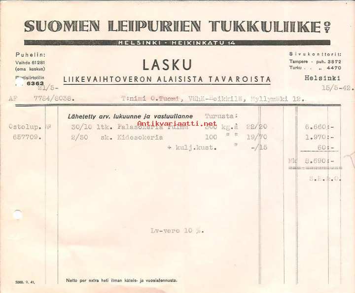Suomen Leipurien Tukkuliike Oy lasku lvv:n alaisista tavaroista 15.5.1942 firmalomake