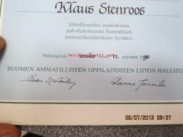 Suomen ammatillisten oppilaitosen liitto / Klaus Stenroos / Kultainen kunniamitali -myöntökirja