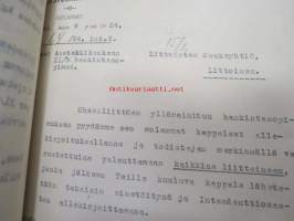 Puolustusministeriö / Littoisten Verkatehdas Oy -kirjeenvaihtokansio, joka käsitteelee tilattuja kankaita, niiden ominaisuuksia, toimituksia ym. puolustusvoimien alkuvaiheilta