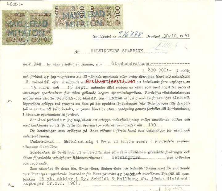 Helsingfors Sparbank vakuutena osakkeita 1961 - velkakirja 8 sivua leimamerkkejä