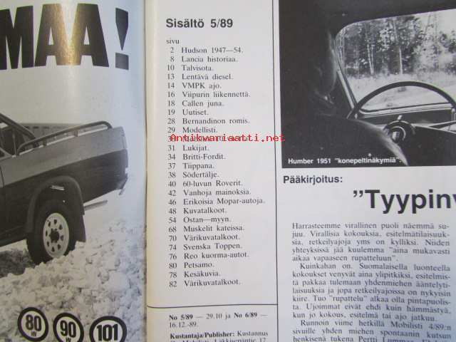 Mobilisti 1989 nr 5 -Lehti vanhojen autojen harrastajille, sisällysluettelo löytyy kuvista.