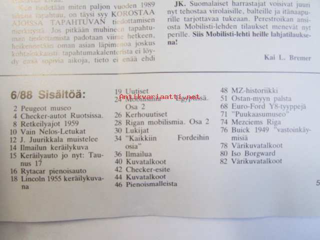 Mobilisti 1988 nr 6 -Lehti vanhojen autojen harrastajille, sisällysluettelo löytyy kuvista.