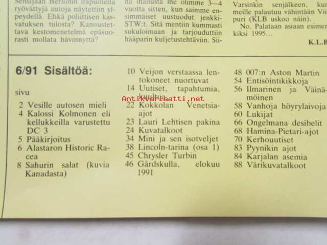 Mobilisti 1991 nr 6 -Lehti vanhojen autojen harrastajille, sisällysluettelo löytyy kuvista.