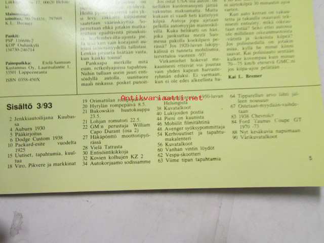 Mobilisti 1993 nr 3 -Lehti vanhojen autojen harrastajille, sisällysluettelo löytyy kuvista.
