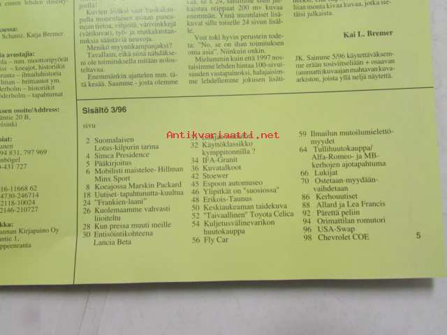 Mobilisti 1996 nr 3 -Lehti vanhojen autojen harrastajille, sisällysluettelo löytyy kuvista.