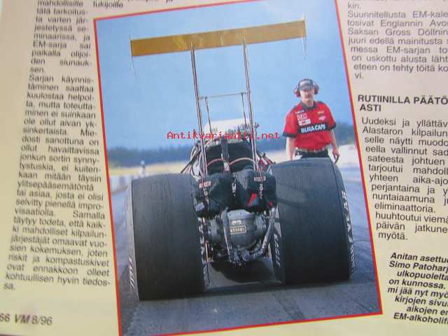 Vauhdin Maailma 1996 nr 8 -mm. Ralli-MM Argentiina Tommi ei ole mikään pommi, Junnu ja Naiset SM Tikkisen vuoro, F-Cup Vammala ja vettä tuli, Formula 1 Ranska Englanti ja Saksa Hermo ei pitänyt, Drag-EM Alastaro Anita voitti heti, Aprilia Moto 6.5, Jokkis-SM Yleinen, Jokkis-SM Naiset, BMW 523 i ja Peugeot 406 SVO, Chrysler Stratus 2.5 V6, Chrustel Stratus Convertible, Chevy Camaro Z28, Elämäni Kisa Esko Nuuttila.21 x 29 cm.
