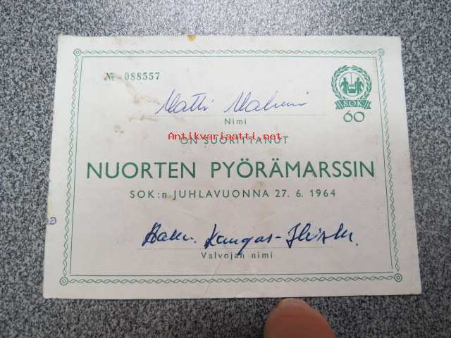 Matti Malmi on suorittanut Nuorten Pyörämarssin SOK:n juhlavuonna 27.6.1964 -osanottotodiste