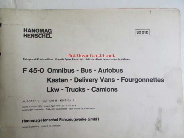 Hanomag Henschel, F45-0 - Omnibus-Bus - Autobus Kasten - Delivery Vans - Fourgonnettes - Lkw - Trucks - Camions, Ausgabe B 1974-varaosakirja, Katso tarkemmat